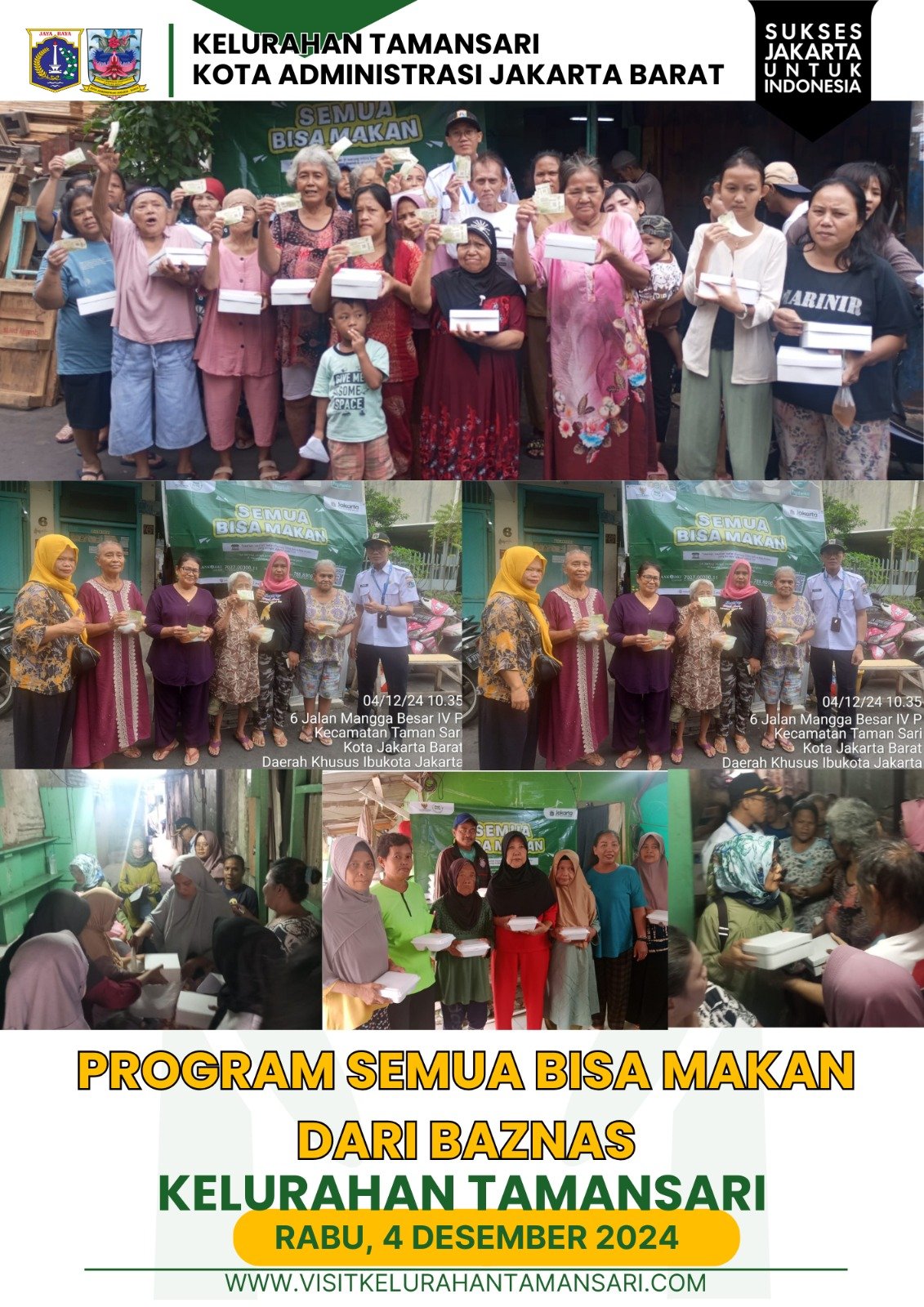 Program Semua Bisa Makan dari Baznas ditujukan kepada berbagai kalangan masyarakat yang membutuhkan, seperti masyarakat miskin dan dhuafa yang tidak mampu menyediakan makanan yang cukup dan bergizi. Kegiatan ini berlangsung selama 2 hari dari tanggal 4-5 Desember 2024. Di Kelurahan Taman Sari sendiri dibagikan sebanyak 450 voucher Program Semua Bisa Makan untuk 2 hari.